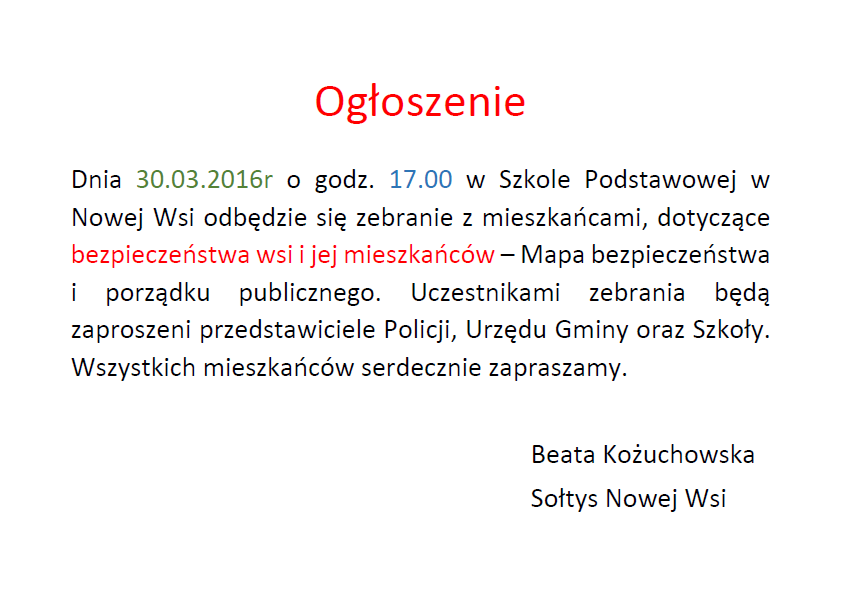 Zapraszam na zebranie mieszkańców – Beata Kożuchowska – Sołtys Opublikowano w dniu 25 marca 2016 Autor: Beata Kożuchowska