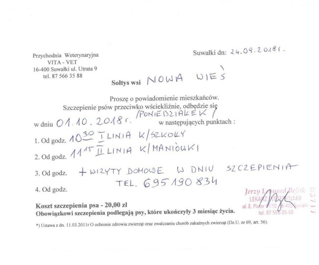 Szczepienie psów 1.10.2018 rok (poniedziałek)